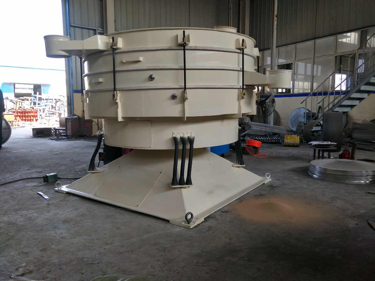 ★因此建立水平与抛掷三维翻滚运动。物料从中心到外缘在整个筛面上均匀分散,从而以螺旋运动往轴向传播。细小颗粒从而完成了整个筛分过程。