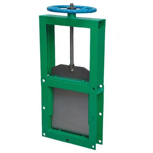 主要由框架、闸板、丝杆、螺母等零件构成,用手转动手轮使丝杆带着丝杆螺母和闸板沿水平方向往复运动,达到闸门的启闭目的。